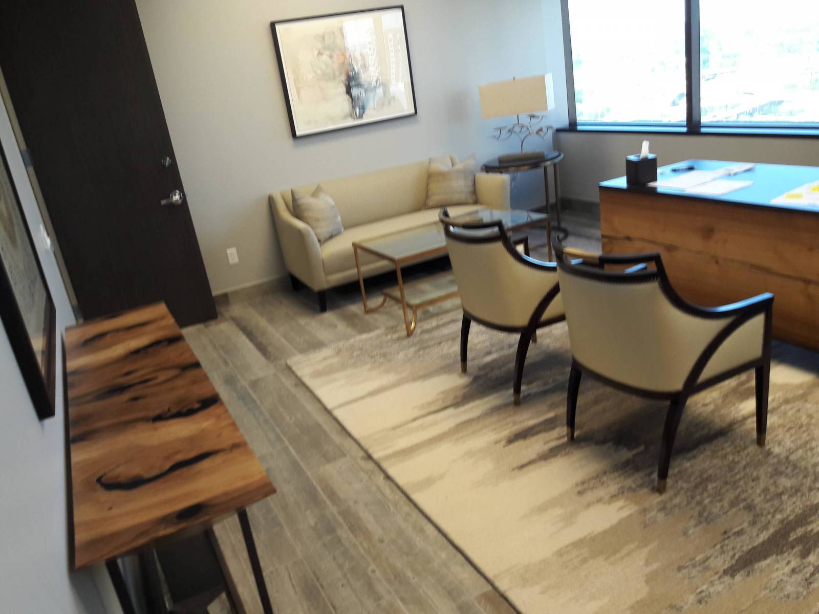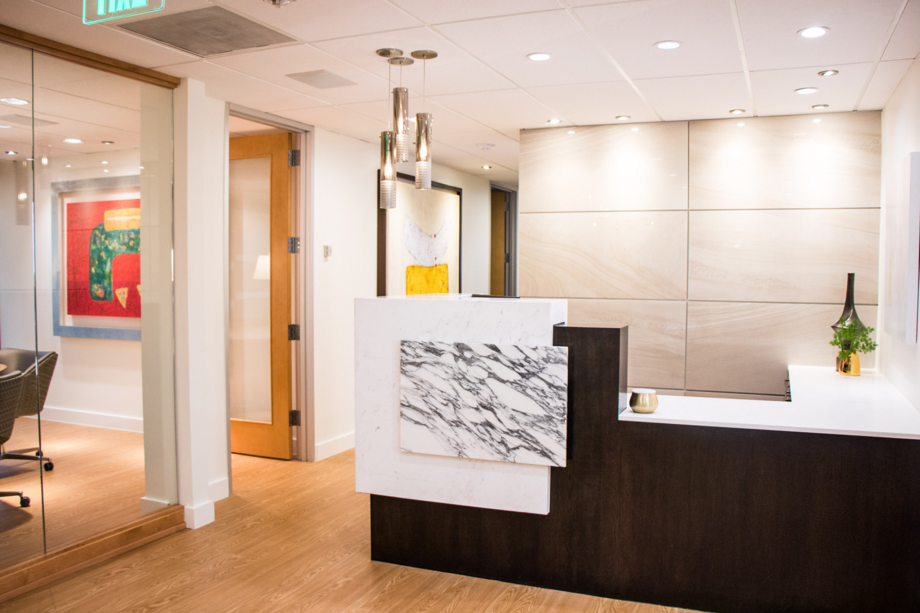 - Recepção: Opte por um balcão de recepção que seja convidativo, mas também imponha respeito. Cadeiras confortáveis para a espera são essenciais.