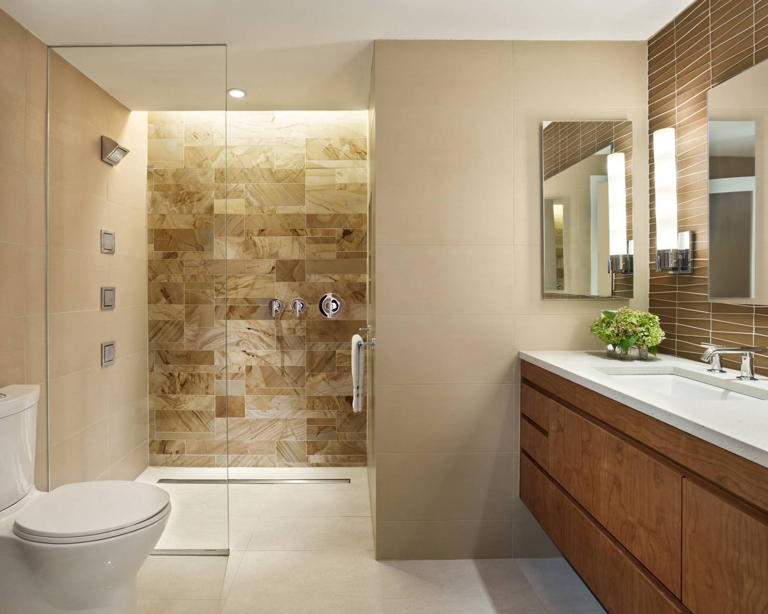 - Considere o uso de luzes embutidas no teto. Elas não ocupam espaço visual e são excelentes para iluminar o banheiro de maneira uniforme.